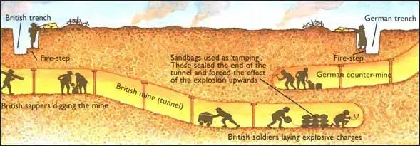 On the Western Front during the First World War, the military employed specialist miners to dig tunnels under No Man's Land. The main objective was to place mines beneath enemy defensive positions. When it was detonated, the explosion would destroy that section of the trench. The infantry would then advance towards the enemy front-line hoping to take advantage of the confusion that followed the explosion of an underground mine.