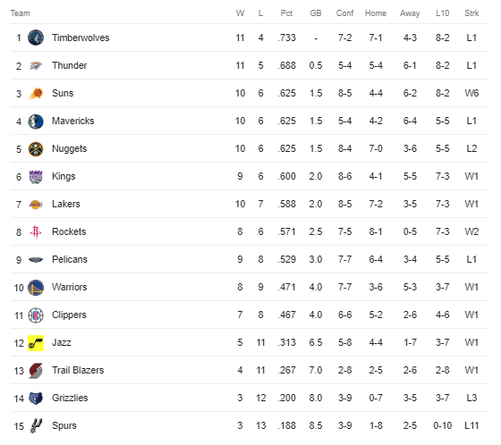Here’s the Western Conference. Notice how the vast majority of teams are on no more than a 1 or 2 game win/loss streak. It’s mind blowing how competitive it is.