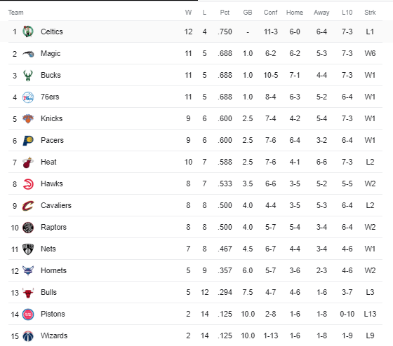 Here’s the Eastern Conference standings. Notice the Pistons and Wizards losing an incredible 22 games in a row!