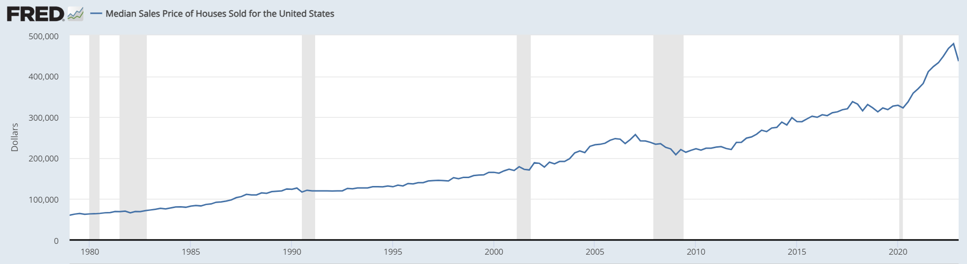 Here’s median home sales prices in the US from 1979-2022: