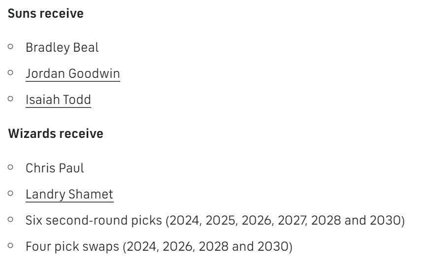 The second most important thing to consider is that the Wizards did not get a whole lot for a multiple time all-star still in his prime. For starters, 38 year-old Chris Paul, while he is going to be a hall-of-famer, is not a heralded prize for a Wizards team that is trying to lose games next season. Want proof? They already flipped him to the Golden State Warriors for younger talent and picks.