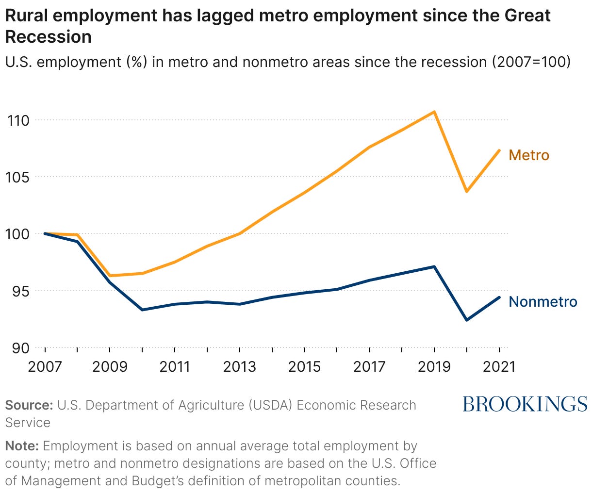 Employment and labor force participation rates in rural areas have still not recovered to pre-Great Recession levels. From most indications, rural America’s economic fortunes continue to diverge from the rest of the country.